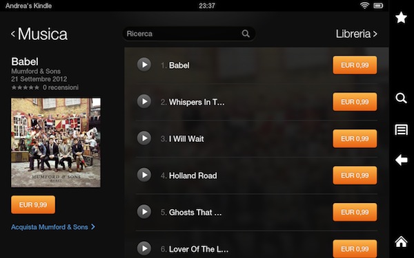Ci sono altri due aspetti interessanti da segnalare. 1) Tutta la musica acquistata sul negozio di Amazon è immediatamente disponibile per l’ascolto in streaming nella sotto-sezione “Cloud” del player musicale del Kindle. 2) I file musicali dell’Amazon Store sono tutti MP3 a 250Kbps privi di DRM. Come tali possono essere riprodotti su qualsiasi dispositivo e importati su Mac o PC tramite cavo senza alcuna limitazione.